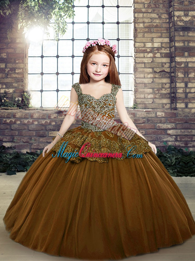 Floor Length Lace Up Pageant Dress for Womens Brown for Party and Military Ball and Wedding Party with Beading and Appliques