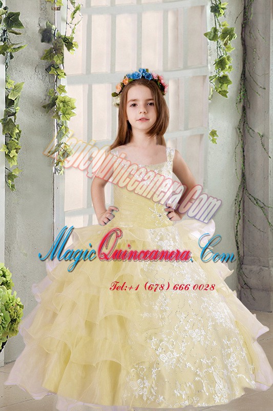 Floor Length Lace Up Pageant Dress Toddler Light Yellow for Party and Wedding Party with Lace and Ruffled Layers