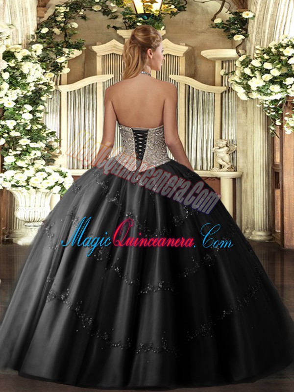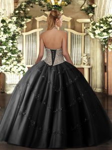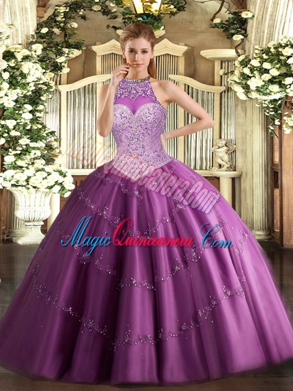 Floor Length Lace Up Quince Ball Gowns Fuchsia for Military Ball and Sweet 16 and Quinceanera with Beading and Appliques