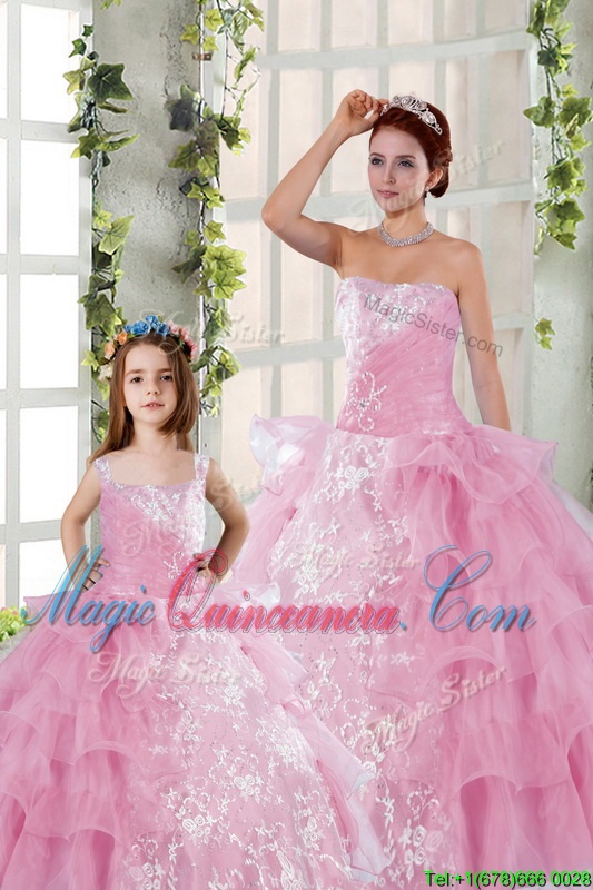 Floor Length Lace Up Quinceanera Gown Rose Pink and In for Military Ball and Sweet 16 and Quinceanera with Beading and Ruffled Layers and Ruching