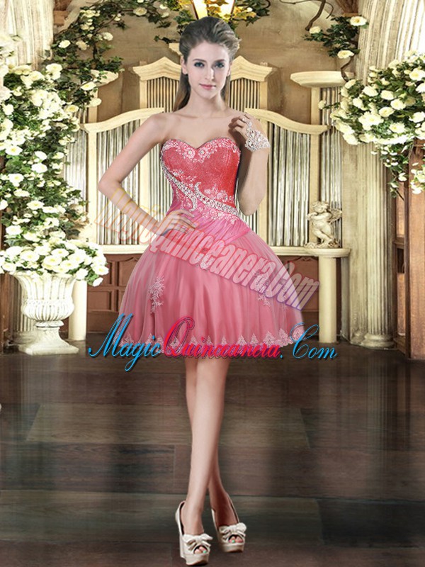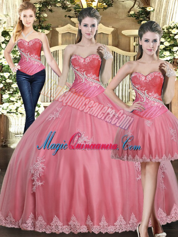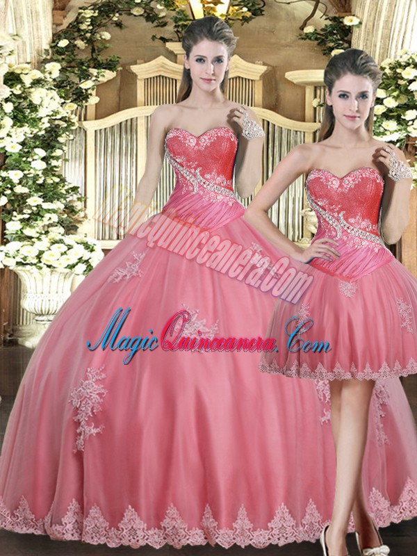 Floor Length Lace Up Sweet 16 Quinceanera Dress Rose Pink for Military Ball and Sweet 16 and Quinceanera with Beading and Appliques