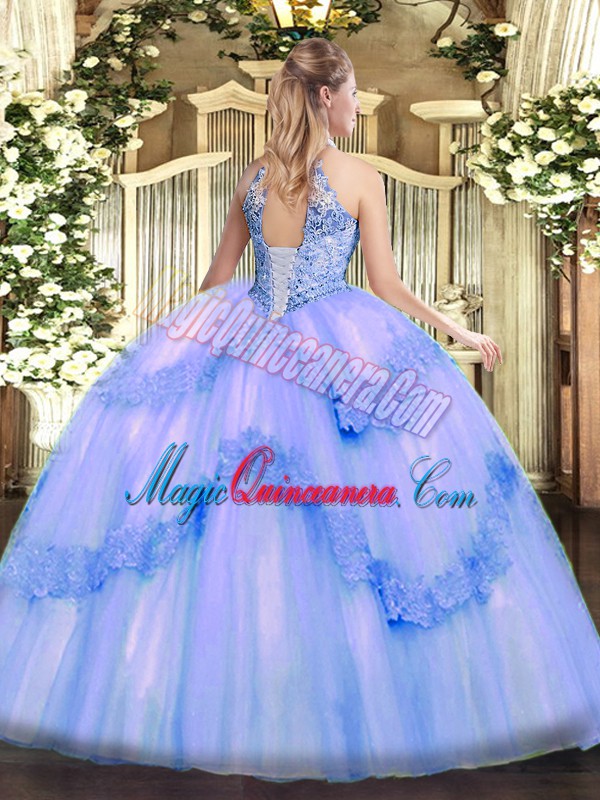 Floor Length Lilac Sweet 16 Dresses Halter Top Sleeveless Lace Up