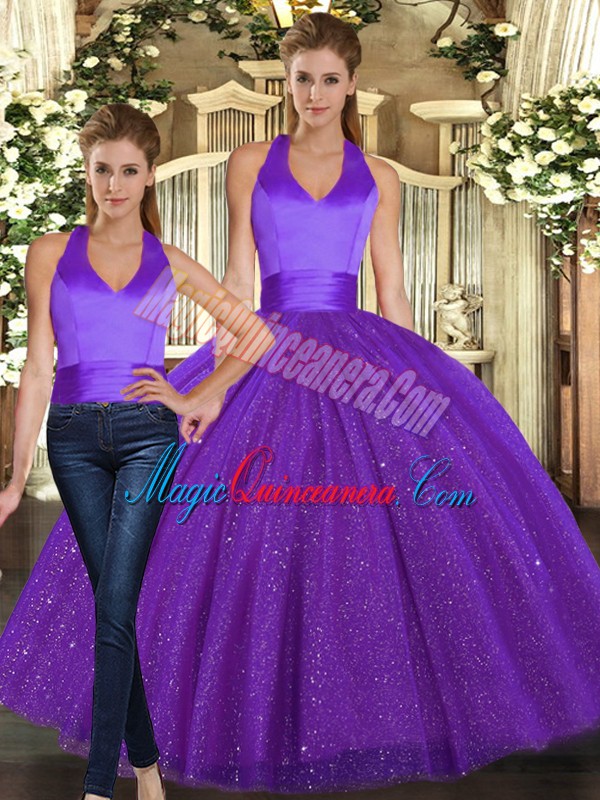 Floor Length Purple Quinceanera Dresses Halter Top Sleeveless Lace Up