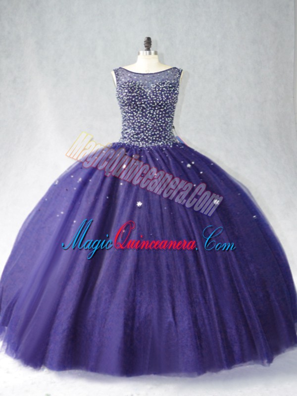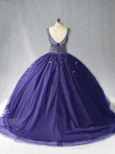 Floor Length Purple Sweet 16 Dress Tulle Sleeveless Beading