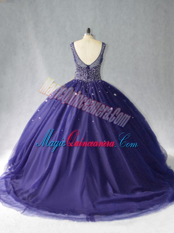 , Floor Length Purple Sweet 16 Dress Tulle Sleeveless Beading