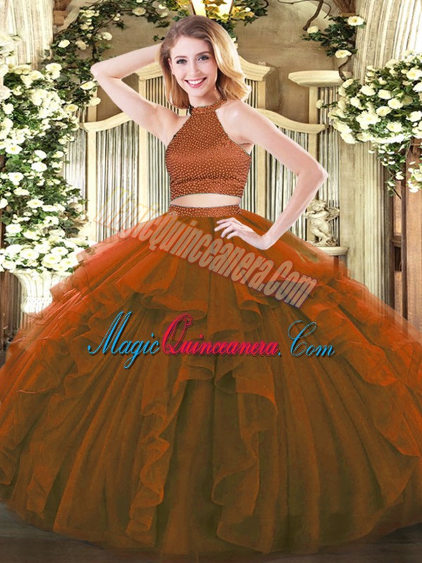 Floor Length Two Pieces Sleeveless Brown 15th Birthday Dress Backless