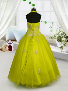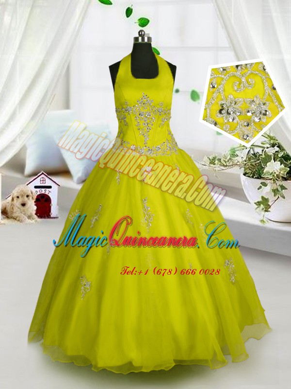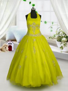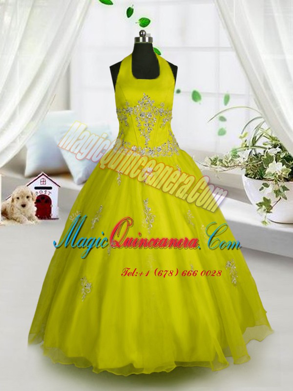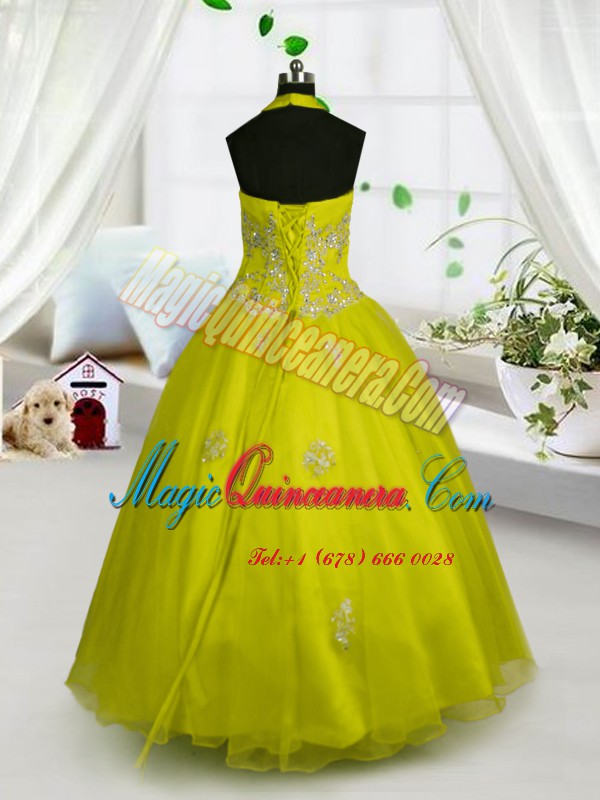 Floor Length Yellow High School Pageant Dress Halter Top Sleeveless Lace Up