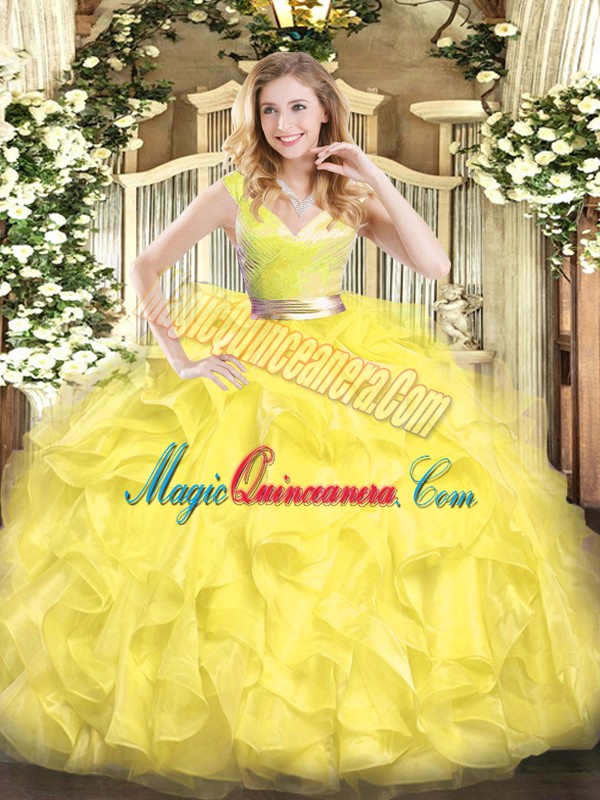 , Floor Length Yellow Sweet 16 Quinceanera Dress Tulle Sleeveless Beading and Ruffles