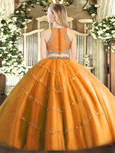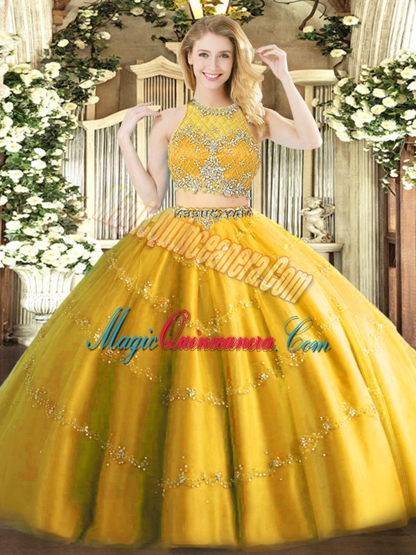Floor Length Zipper 15th Birthday Dress Gold for Military Ball and Sweet 16 and Quinceanera with Beading