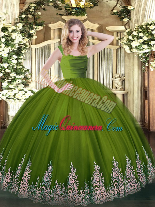 Floor Length Zipper Ball Gown Prom Dress Olive Green for Military Ball and Sweet 16 and Quinceanera with Lace and Appliques