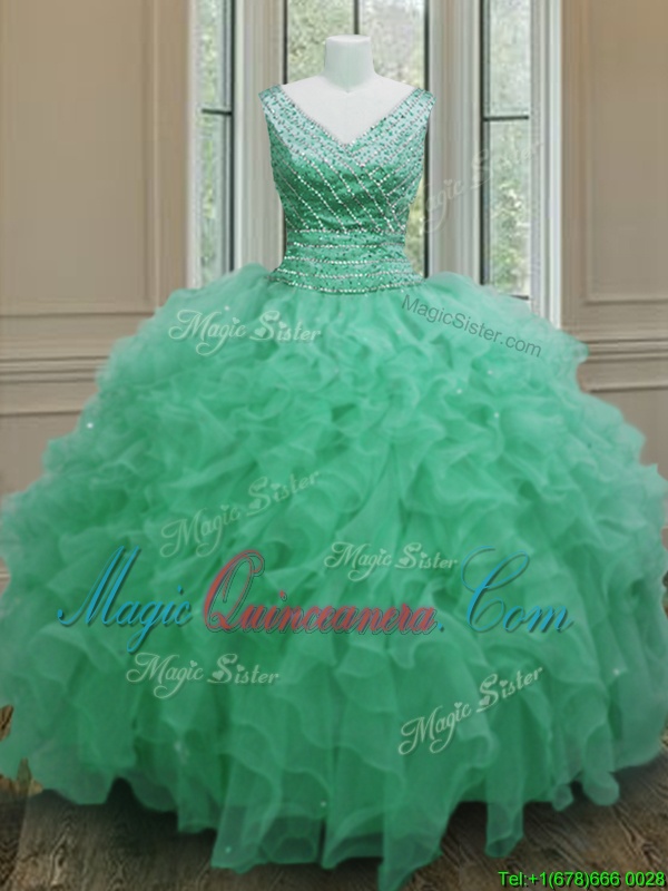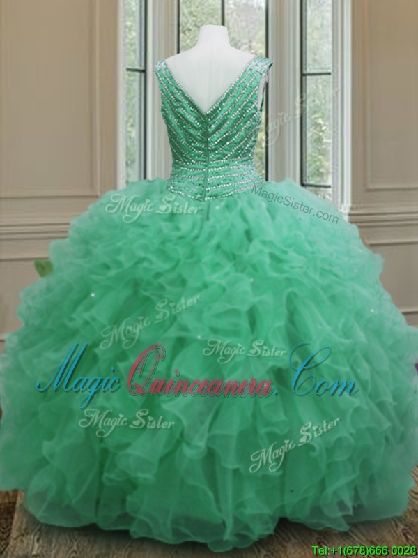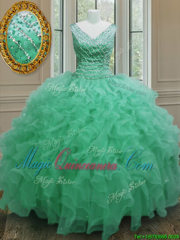 Floor Length Zipper Quinceanera Dress Apple Green and In for Military Ball and Sweet 16 and Quinceanera with Beading and Ruffles