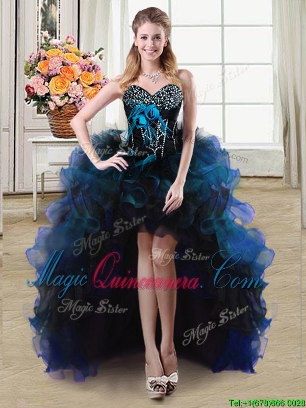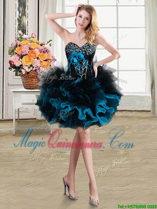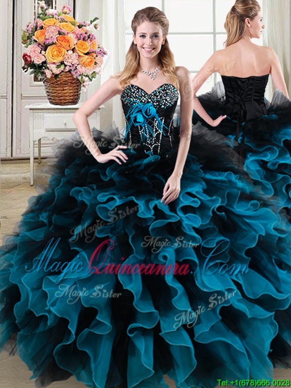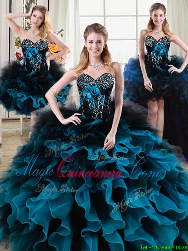 Four Piece Black and Blue Lace Up 15 Quinceanera Dress Beading and Ruffles and Hand Made Flower Sleeveless Floor Length