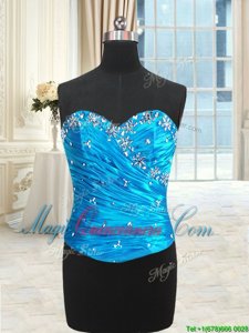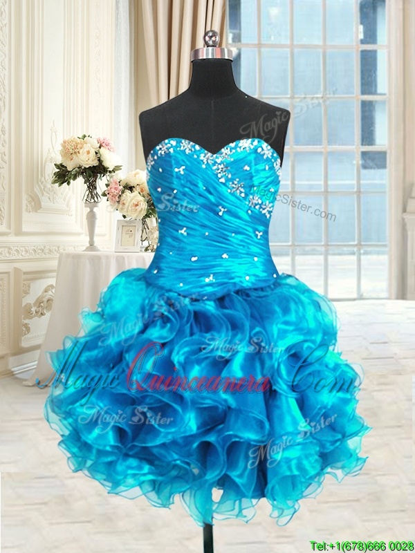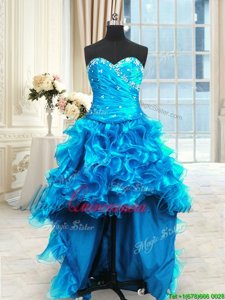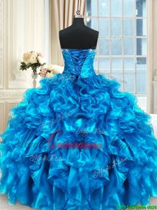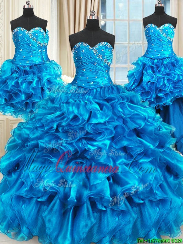 Four Piece Blue Organza Lace Up Sweetheart Sleeveless Floor Length Sweet 16 Quinceanera Dress Beading and Ruffles and Ruching