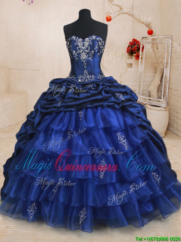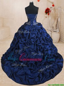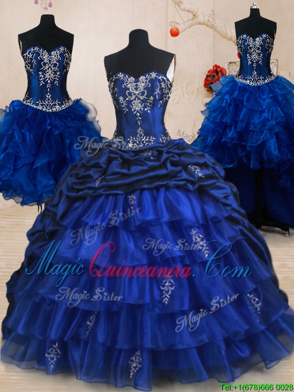 Four Piece Pick Ups Ruffled Sweetheart Sleeveless Brush Train Lace Up Quinceanera Dress Royal Blue Organza and Taffeta