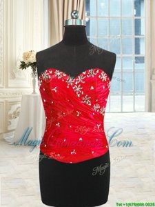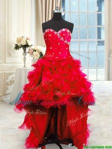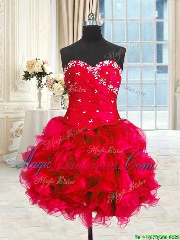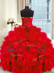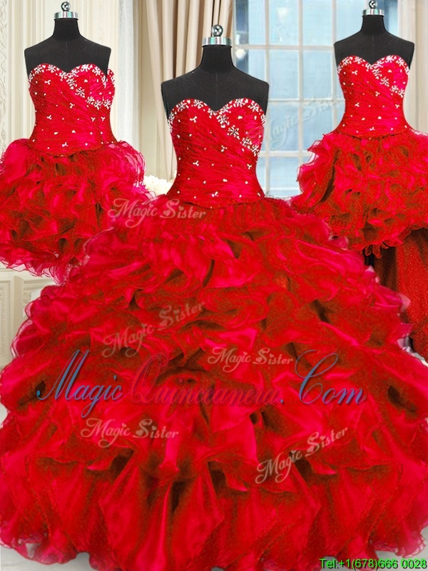 Four Piece Red Lace Up Sweet 16 Dresses Beading and Ruffles and Ruching Sleeveless Floor Length