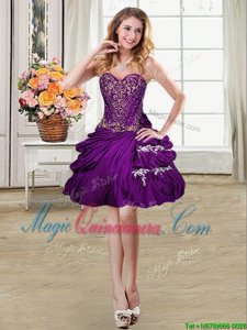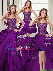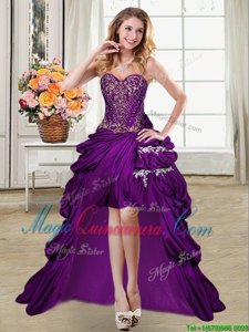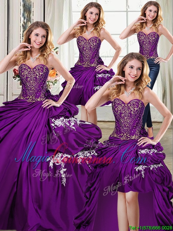 , Four Piece Sleeveless Taffeta Floor Length Lace Up Quinceanera Dress in Purple for with Beading and Appliques and Pick Ups