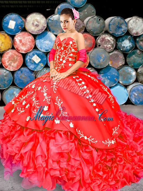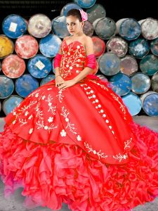 Free and Easy Red Lace Up Quinceanera Gown Embroidery and Ruffles Sleeveless Brush Train