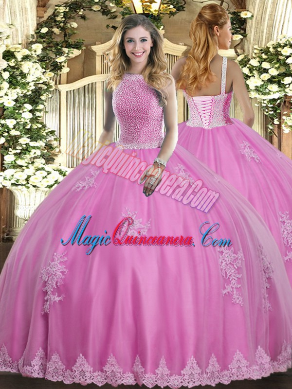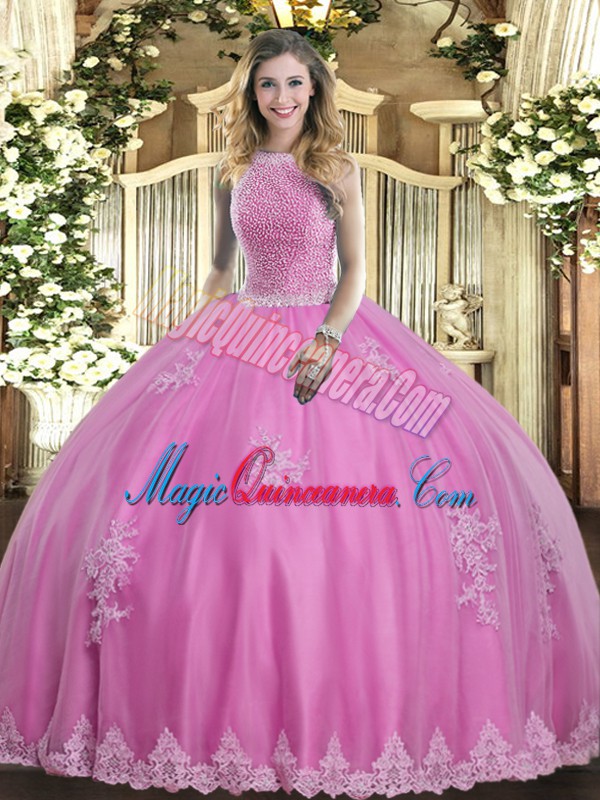 Free and Easy Rose Pink Tulle Lace Up 15th Birthday Dress Sleeveless Floor Length Beading and Appliques