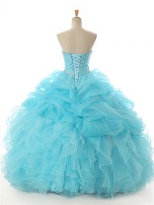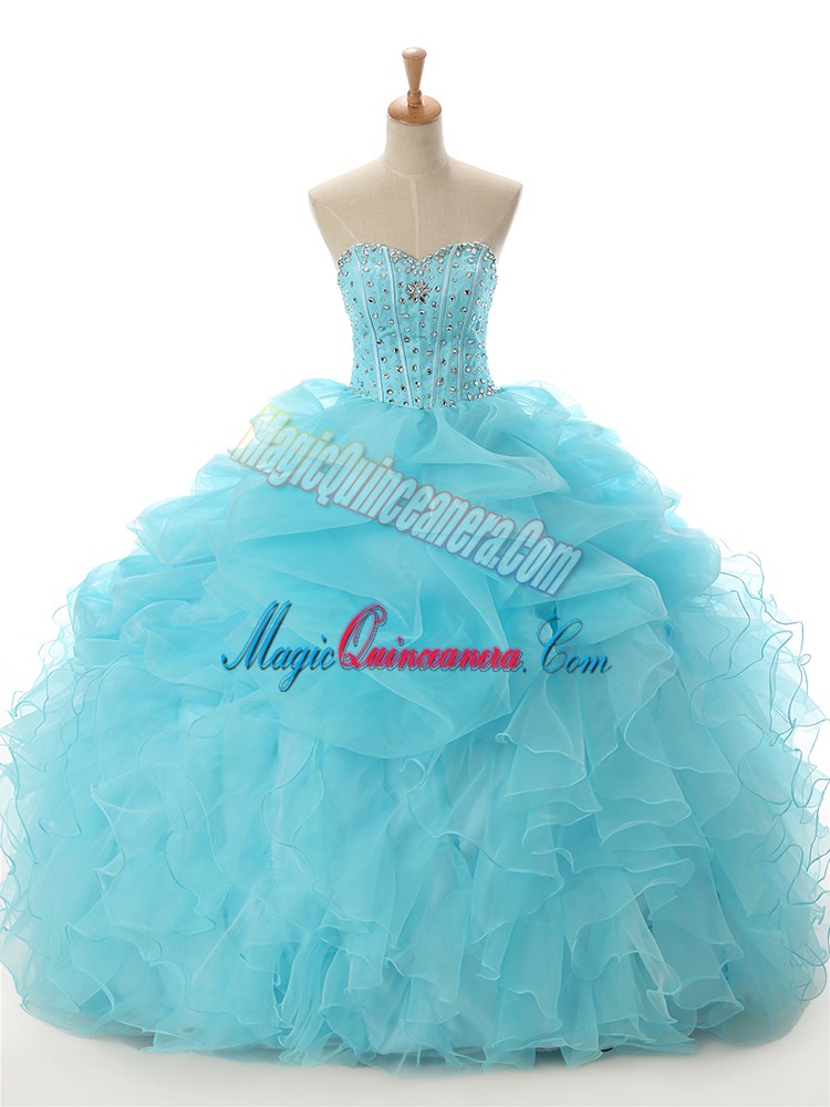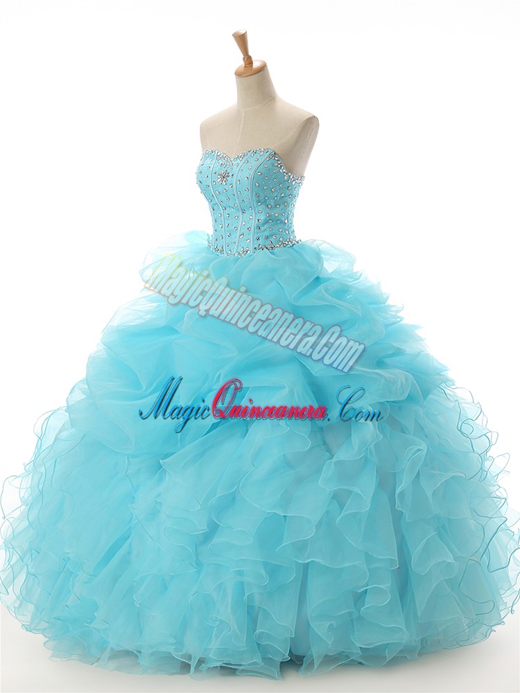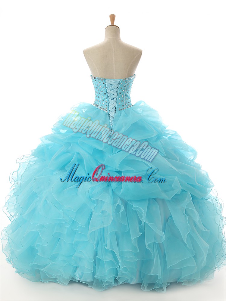 Free and Easy Sleeveless Organza Floor Length Lace Up Ball Gown Prom Dress in Aqua Blue with Beading and Ruffled Layers