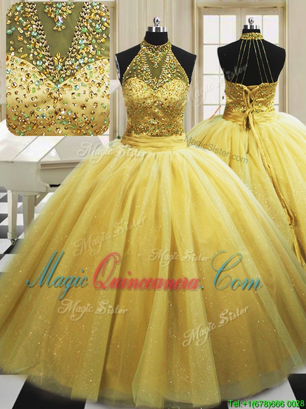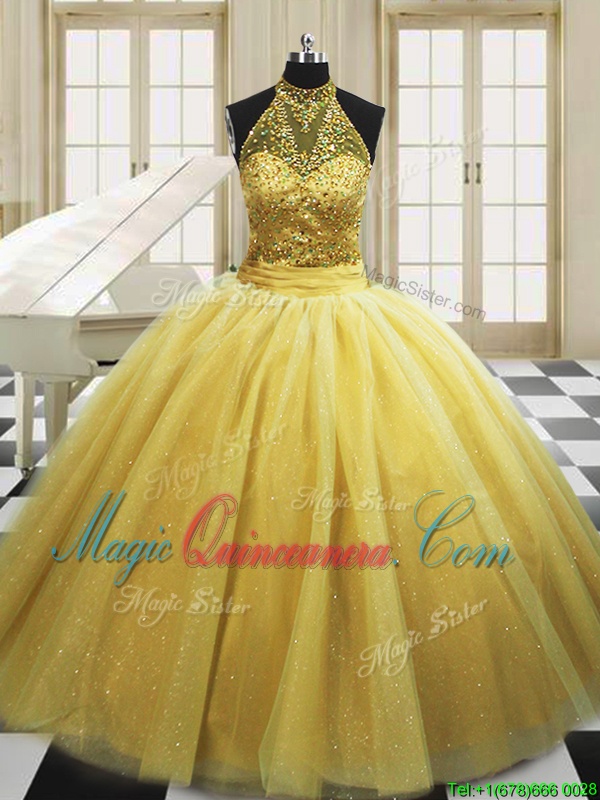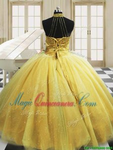 Free and Easy Sleeveless With Train Beading Lace Up Sweet 16 Dress with Yellow Sweep Train