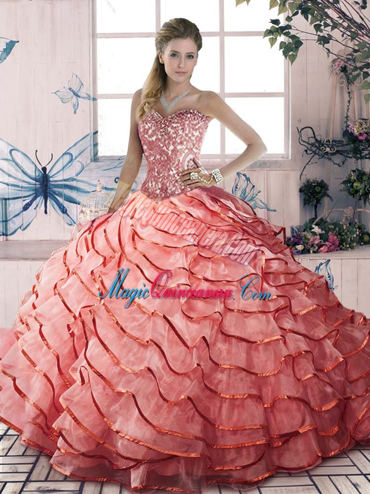 Free and Easy Watermelon Red Lace Up Sweetheart Beading and Ruffled Layers Ball Gown Prom Dress Organza Sleeveless Brush Train