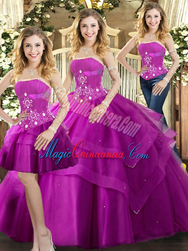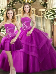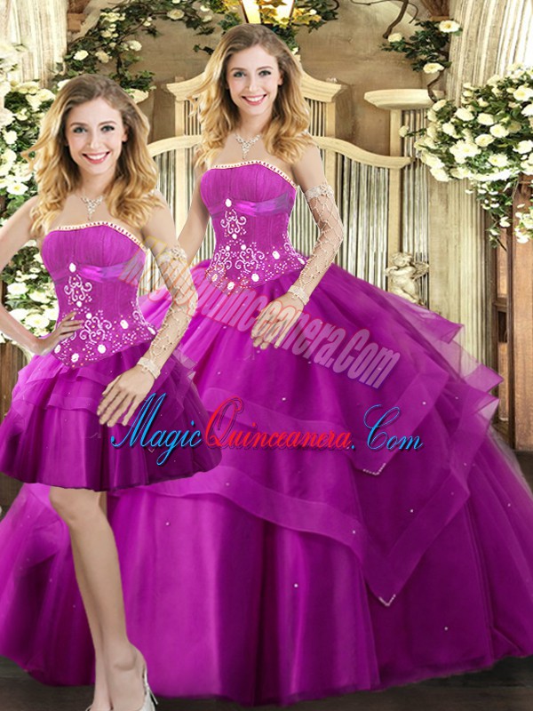 Fuchsia Ball Gown Prom Dress Sweet 16 and Quinceanera with Beading and Ruffled Layers Strapless Sleeveless Lace Up