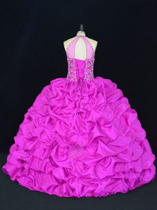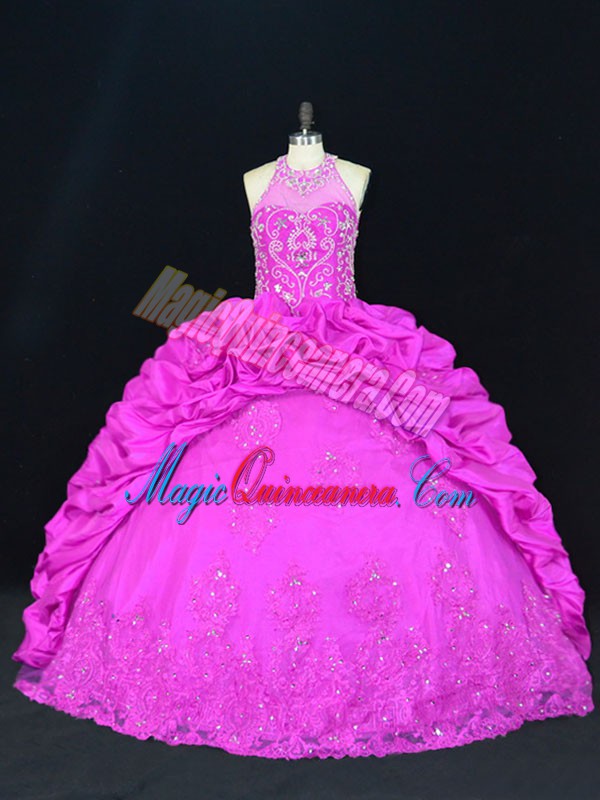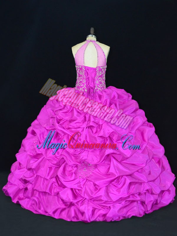Fuchsia Ball Gowns Halter Top Sleeveless Taffeta Floor Length Lace Up Beading and Appliques and Pick Ups Quinceanera Gown