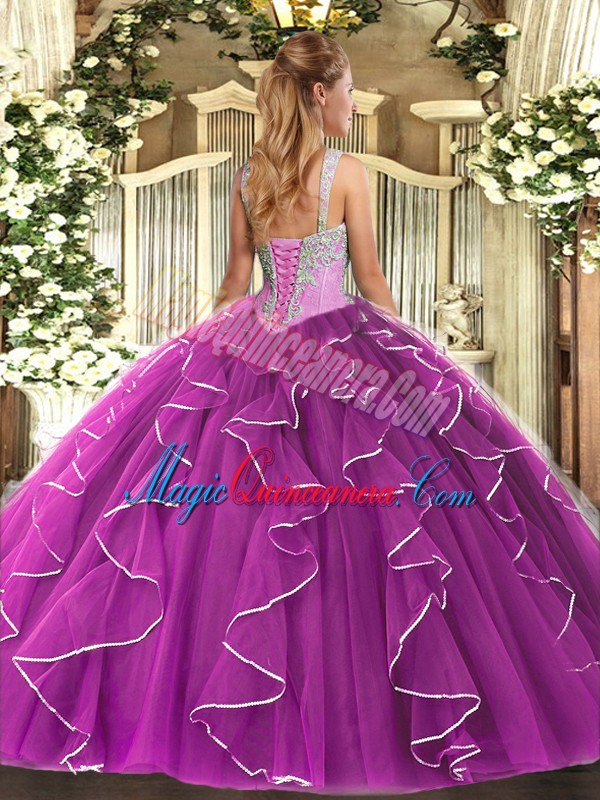 Fuchsia Lace Up Straps Beading Vestidos de Quinceanera Tulle Sleeveless