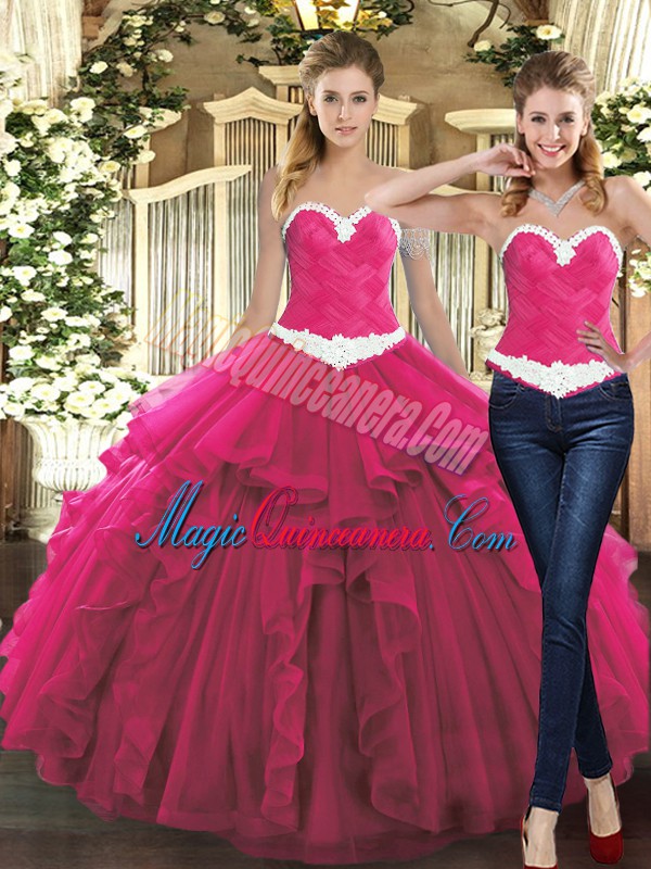 Fuchsia Lace Up Sweetheart Ruffles 15th Birthday Dress Tulle Sleeveless