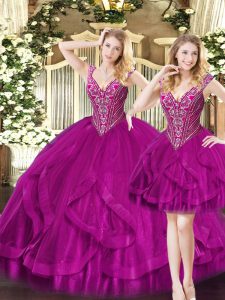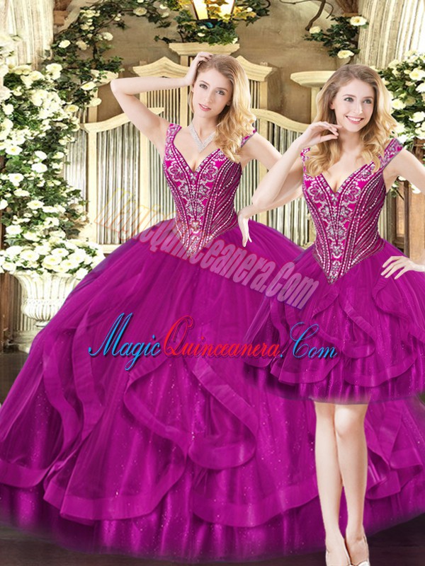 Fuchsia Lace Up V-neck Beading and Ruffles Vestidos de Quinceanera Organza Sleeveless