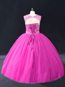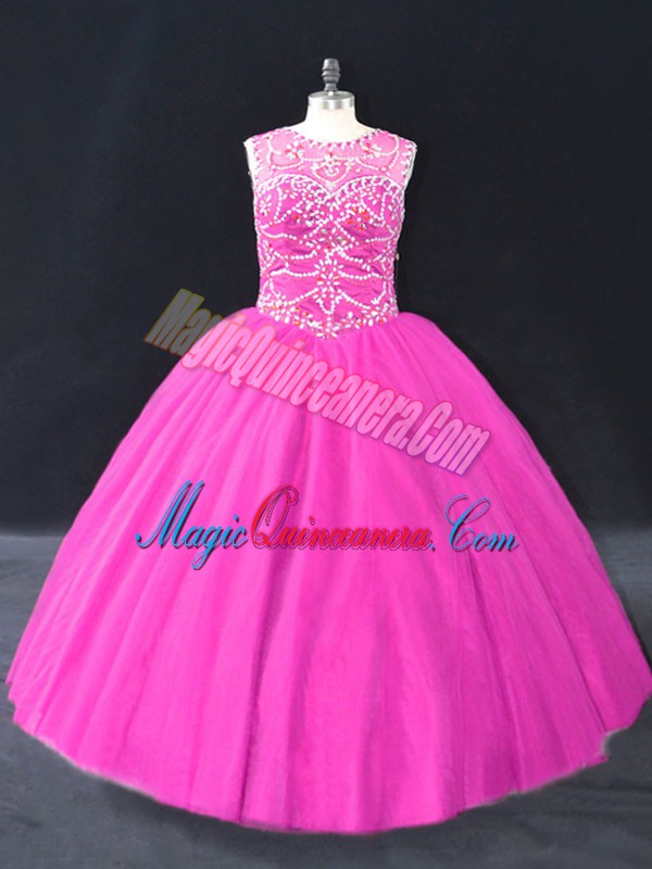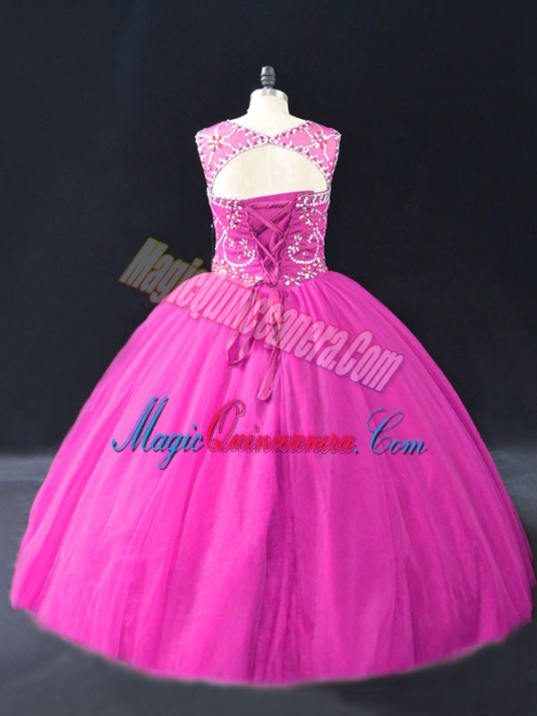 Fuchsia Lace Up Vestidos de Quinceanera Beading Sleeveless Floor Length