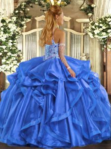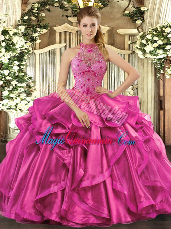 Fuchsia Quinceanera Gown Sweet 16 and Quinceanera with Beading and Embroidery and Ruffles Halter Top Sleeveless Lace Up