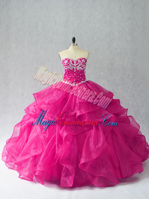Fuchsia Sweetheart Neckline Beading and Ruffles Quinceanera Dress Sleeveless Lace Up