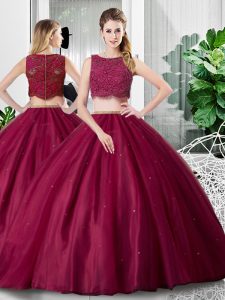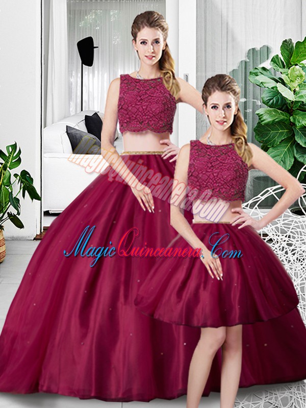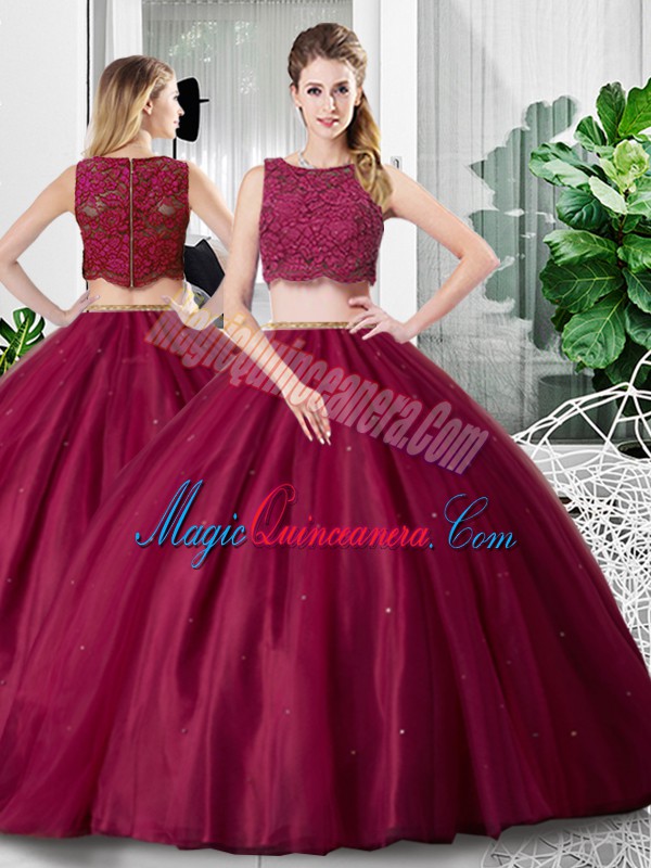 Fuchsia Tulle Zipper Scoop Sleeveless Floor Length 15th Birthday Dress Lace and Ruching