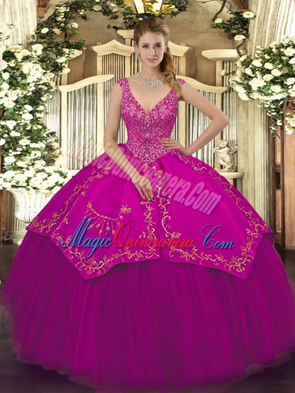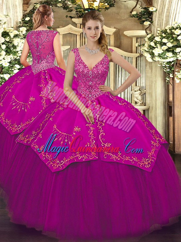 Fuchsia V-neck Neckline Beading and Embroidery Quinceanera Dress Sleeveless Zipper
