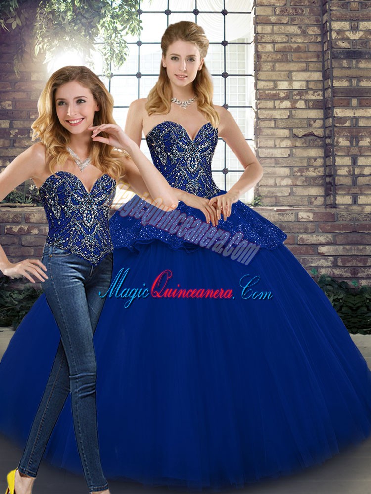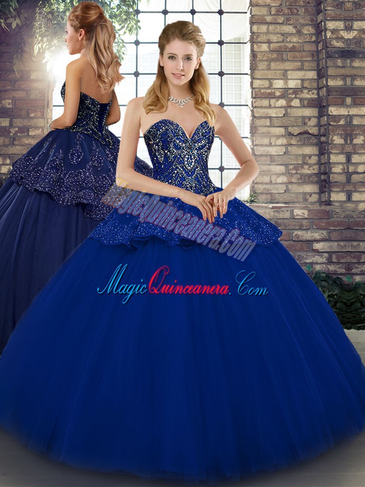 Glamorous Floor Length Lace Up 15th Birthday Dress Royal Blue for Military Ball and Sweet 16 and Quinceanera with Beading and Appliques