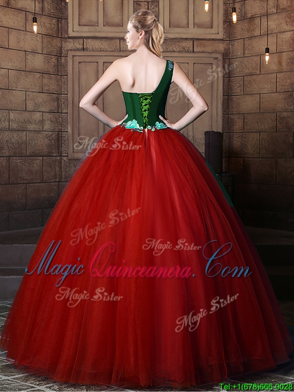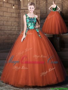 Glamorous Rust Red Ball Gowns Tulle One Shoulder Sleeveless Pattern Floor Length Lace Up Quince Ball Gowns