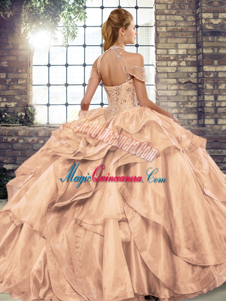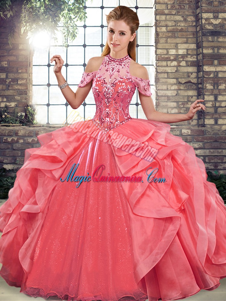 Glamorous Watermelon Red Halter Top Lace Up Beading and Ruffles Sweet 16 Quinceanera Dress Sleeveless