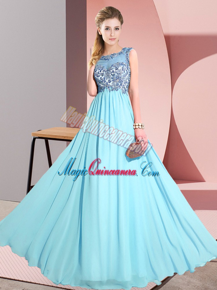 Glittering Floor Length Aqua Blue Vestidos de Damas Chiffon Sleeveless Beading and Appliques