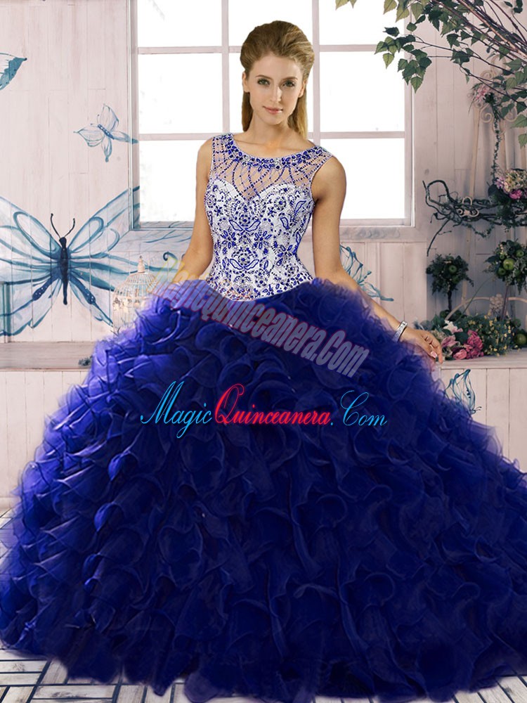 Glittering Floor Length Purple Quinceanera Dresses Organza Sleeveless Beading and Ruffles