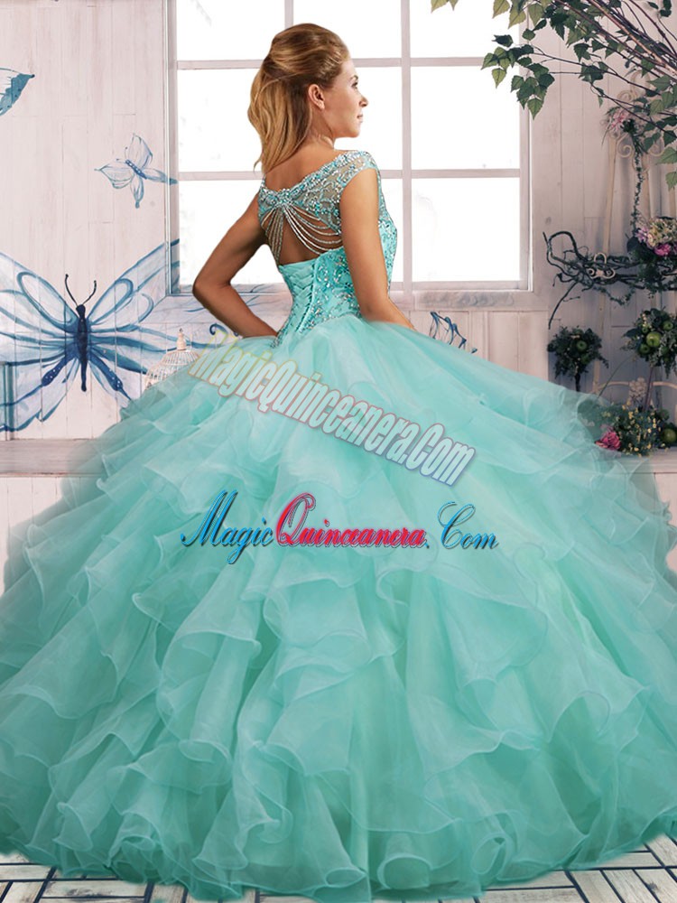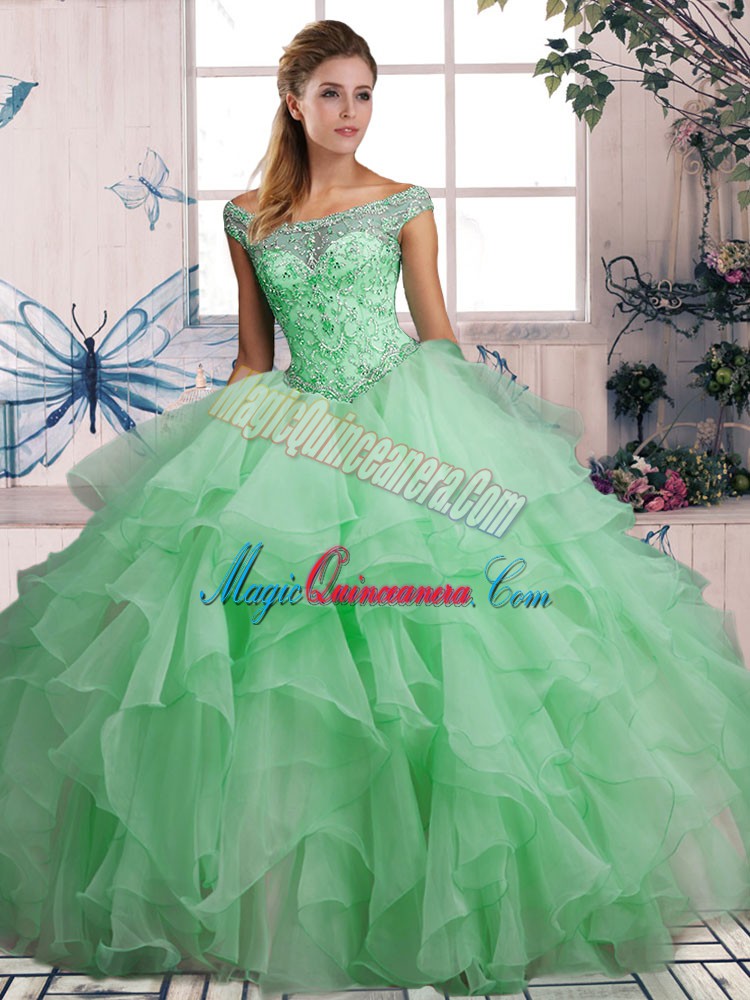 Glorious Apple Green Ball Gowns Beading and Ruffles Quinceanera Dress Lace Up Organza Sleeveless Floor Length