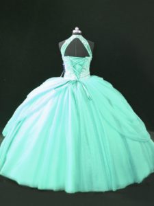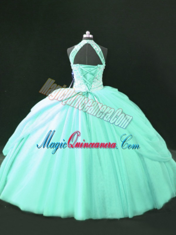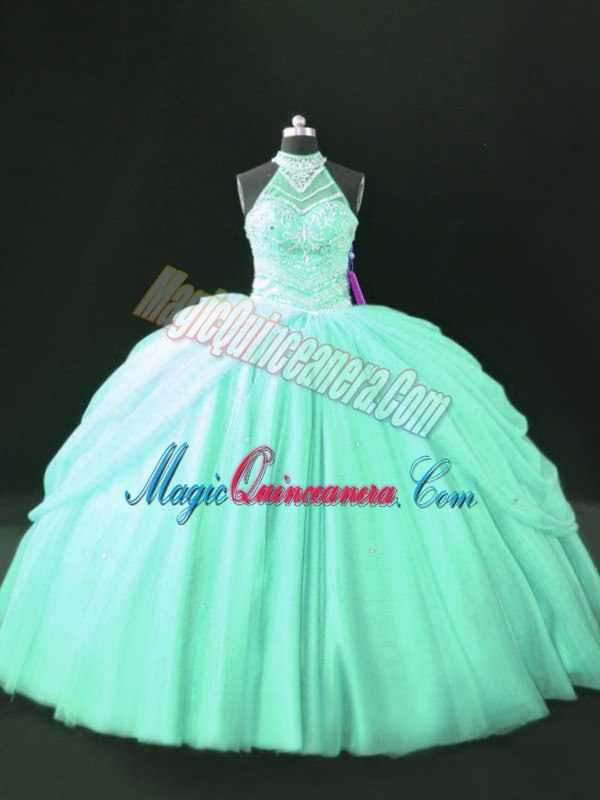 , Glorious Apple Green Lace Up Halter Top Beading Quinceanera Dresses Tulle Sleeveless