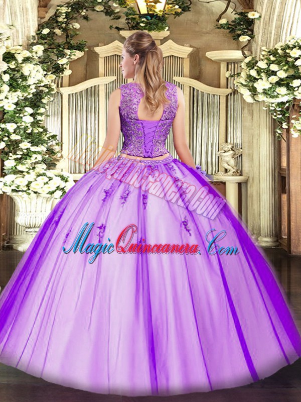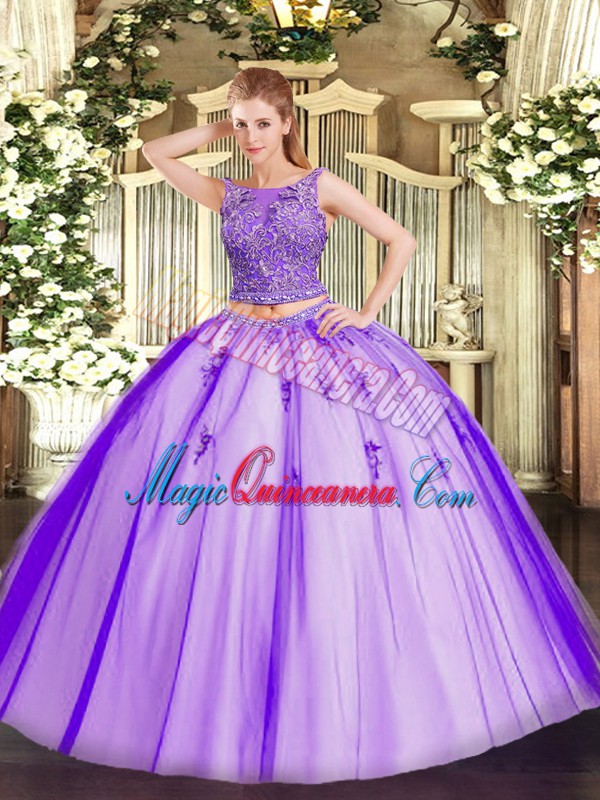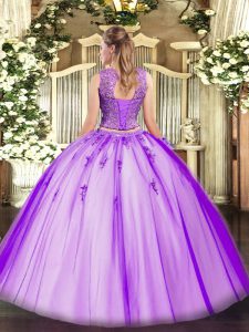 , Glorious Floor Length Lavender Sweet 16 Dress Tulle Sleeveless Beading and Appliques