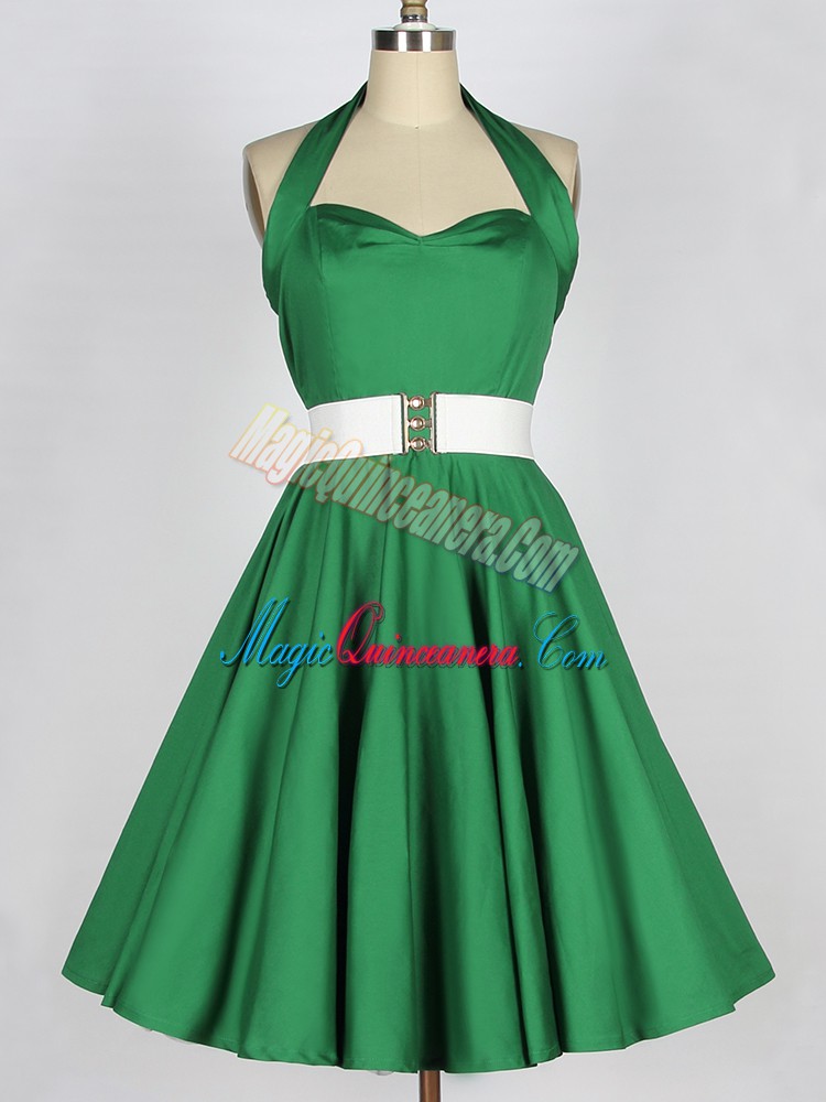 Glorious Mini Length Green Dama Dress Satin Sleeveless Belt