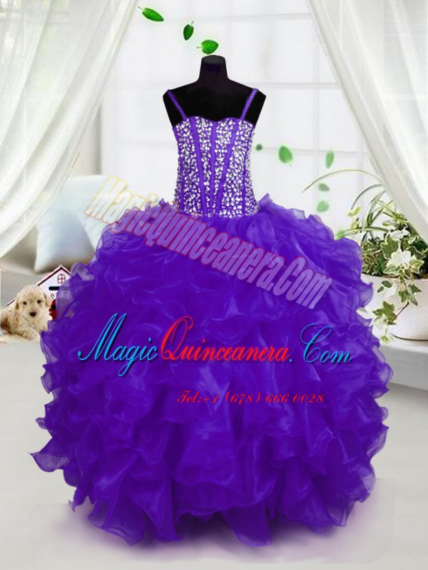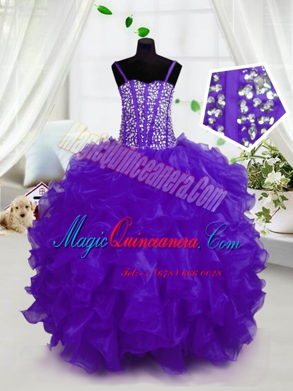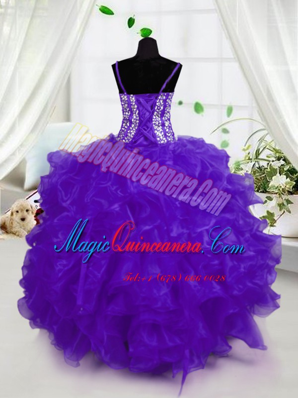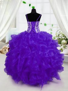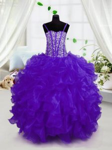 Glorious Purple Organza Lace Up Pageant Dress for Girls Sleeveless Floor Length Beading and Ruffles