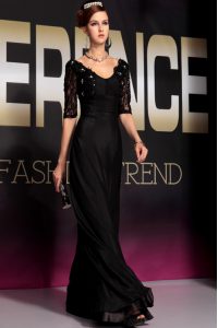 Glorious Scoop Half Sleeves Mother Of The Bride Dress Floor Length Lace and Ruching Black Chiffon