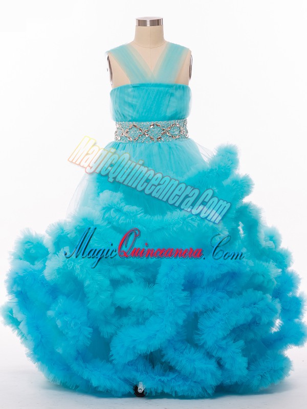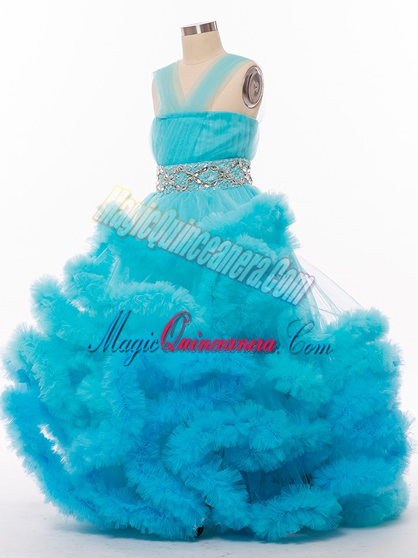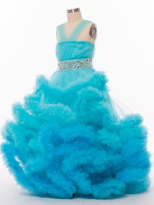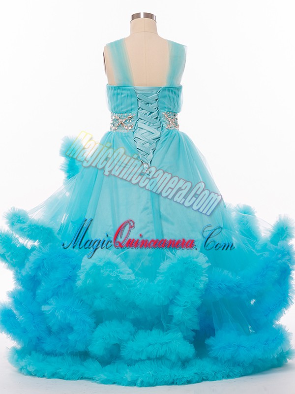 Glorious Tulle Sleeveless Floor Length Girls Pageant Dresses and Beading and Hand Made Flower