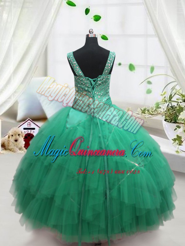 Glorious Turquoise Lace Up Little Girls Pageant Gowns Beading and Ruffles Sleeveless Floor Length