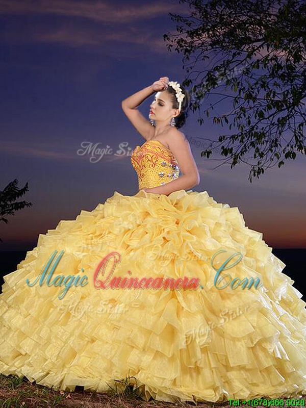 Glorious Yellow Organza Lace Up Quinceanera Gown Sleeveless Floor Length Beading and Ruffled Layers