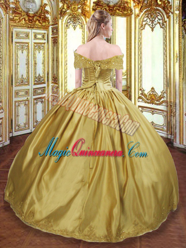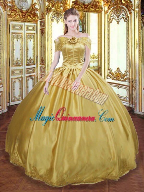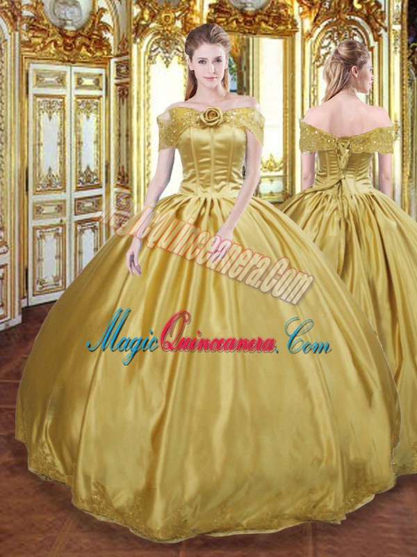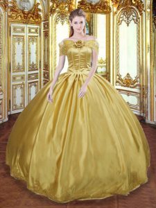 Gold Ball Gowns Tulle Off The Shoulder Sleeveless Beading and Appliques and Hand Made Flower Floor Length Lace Up Quinceanera Dress